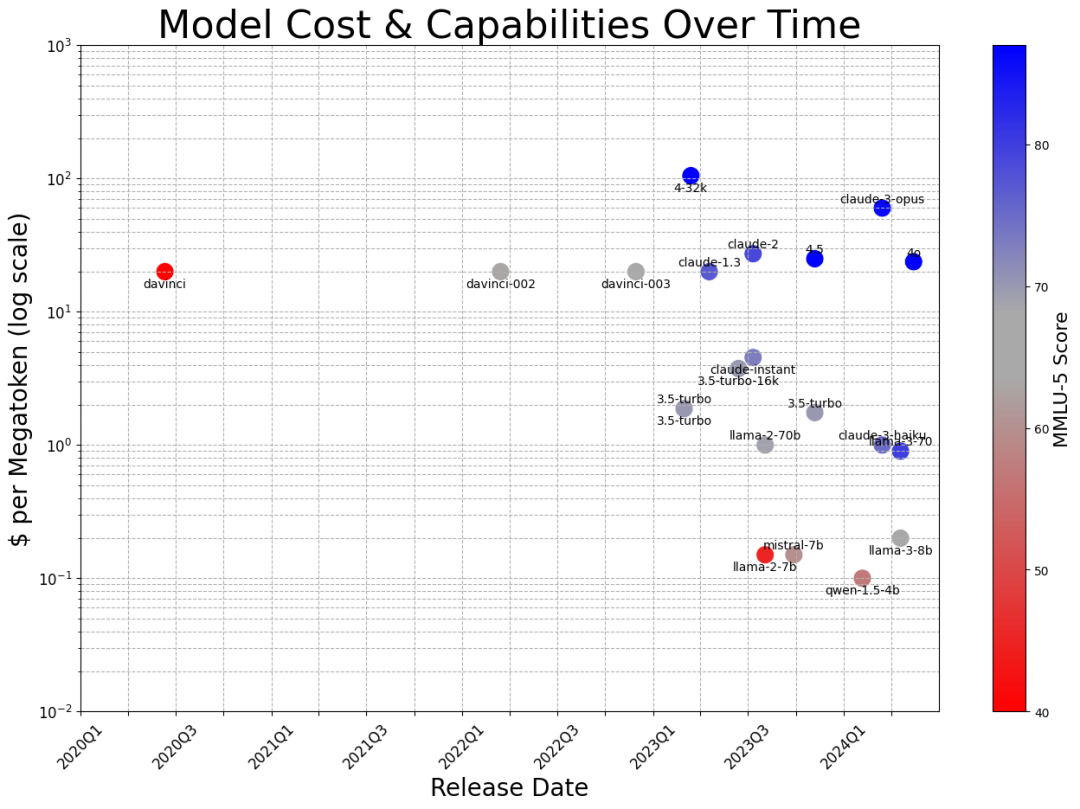 图表:对于固定成本,其能力正迅速提升。对于固定能力水平,其成本正迅速降低。图表由共同作者Charles Frye使用2024年5月13日的公开数据绘制而成。
