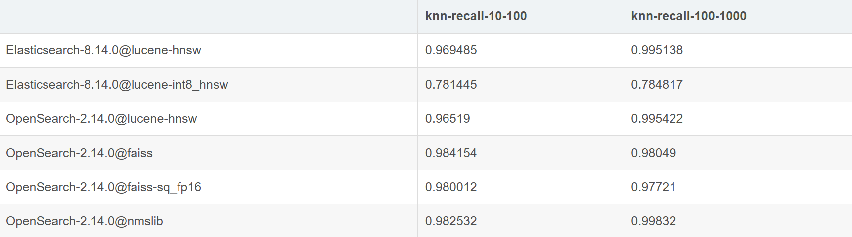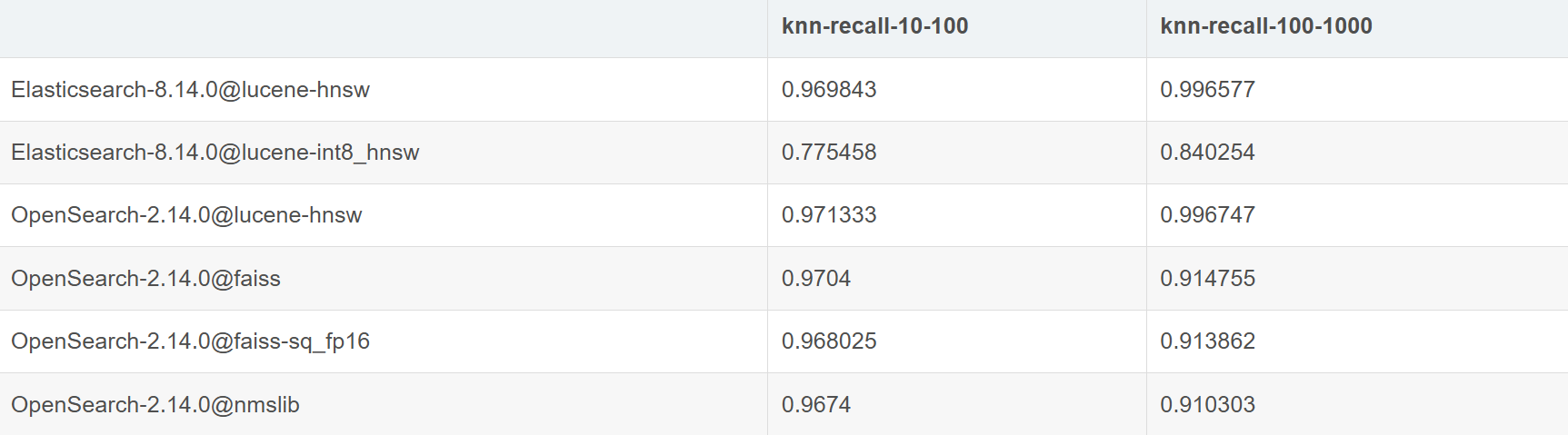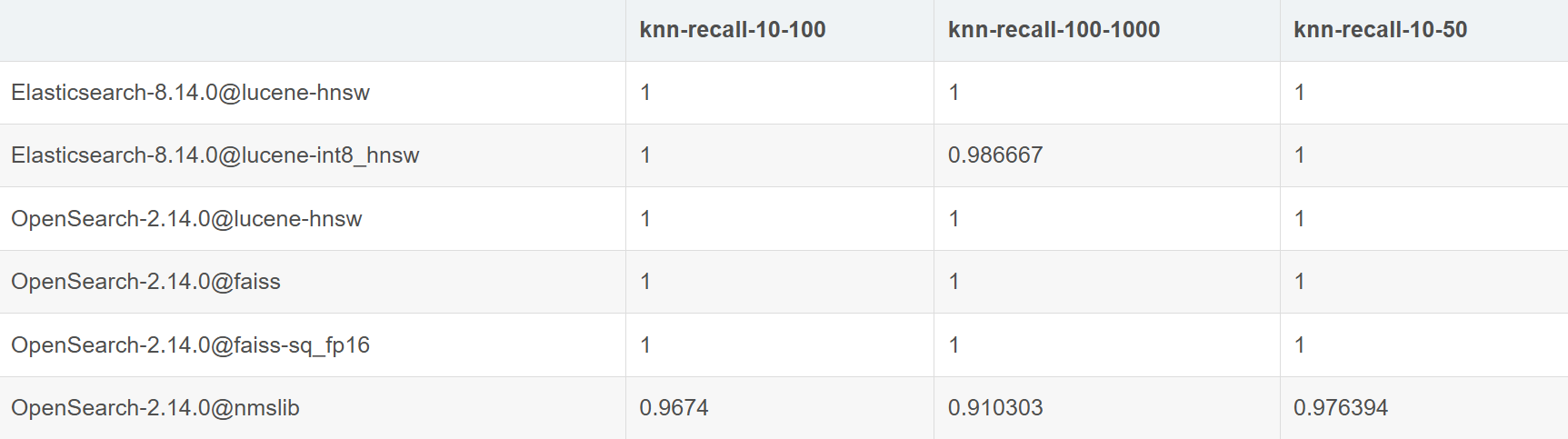 - knn-search-100-1000-concurrent-with-indexing:搜索 1000 万个向量,同时更新 5% 的数据集,k:100 和n:1000