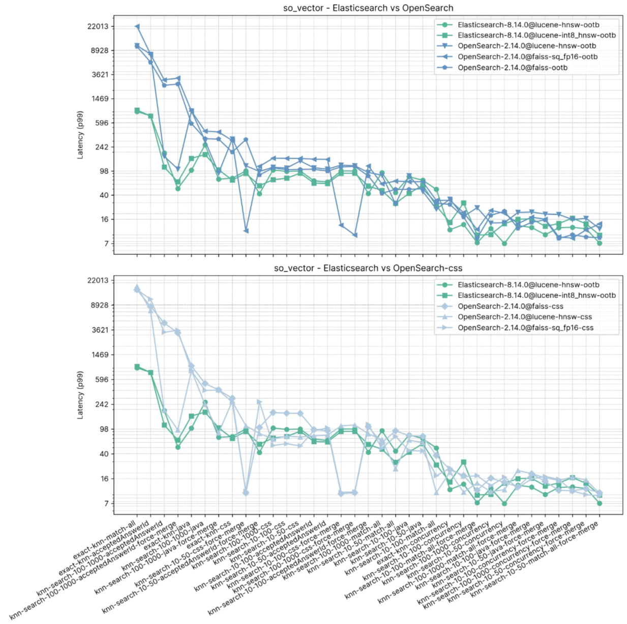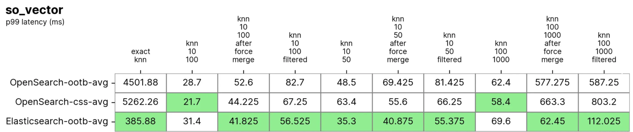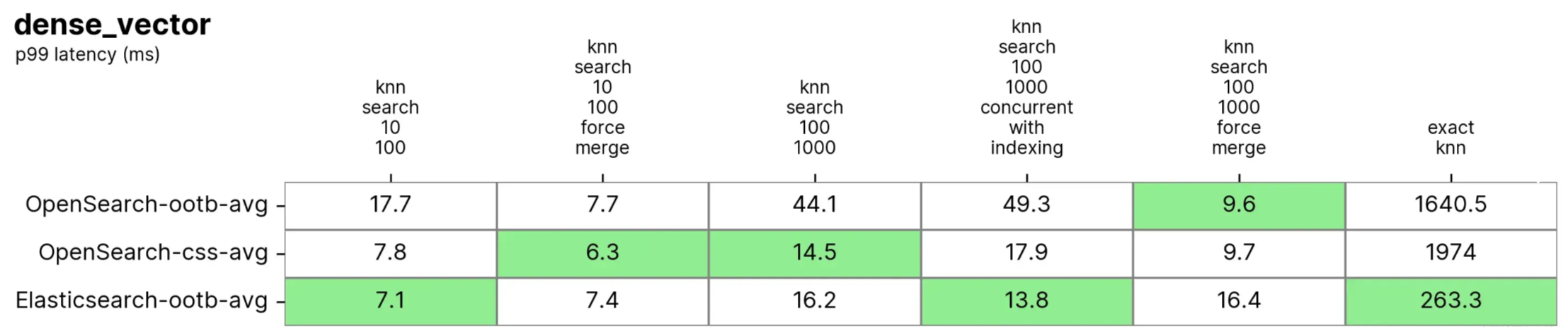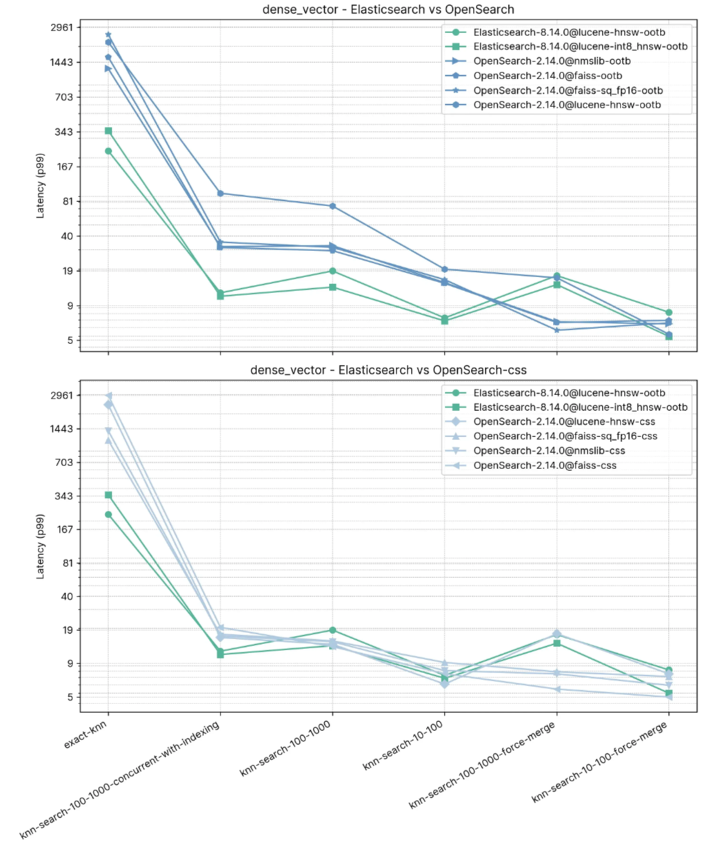 Exact KNN 的性能再次大不相同,Elasticsearch 这次比 OpenSearch 快 13 倍(~385ms vs ~5262ms)。
