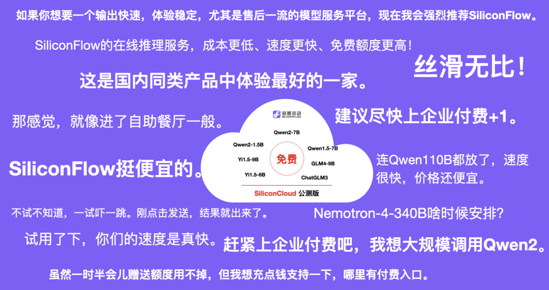 SiliconCloud 一经发布,不少开发者就在各大社交平台分享了使用体验。部分 “自来水” 用户是这样评价的: