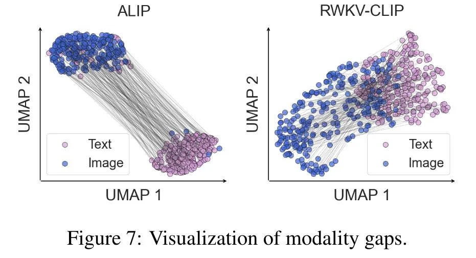 论文结果显示:与 ALIP 相比,RWKV-CLIP 在图像文本模态空间中表现出更近的距离,表明具有卓越的跨模态对齐性能。