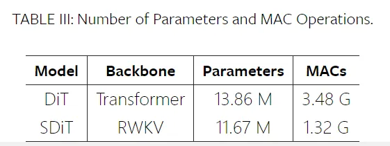 和基于 Transformer 的 ANN 实现 (DiT) 相比,基于 RWKV 的 SDiT 方法拥有更小的参数和更低的乘法累加 (MAC) ,充分展示了低功耗 SNN 的优势。