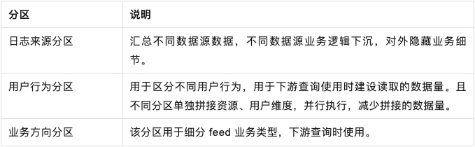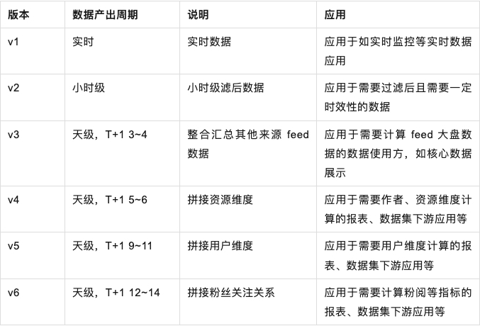 - 版本拆分思路:feed 汇总数据、资源维度、用户维度、关注关系等,产出时效不同,按照对数据时效性要求的不同以及维度表就绪的时间,不提供版本拼接不同的维度数据,既提升对应维度的产出时效,也减少数据 JOIN 时的数据量。