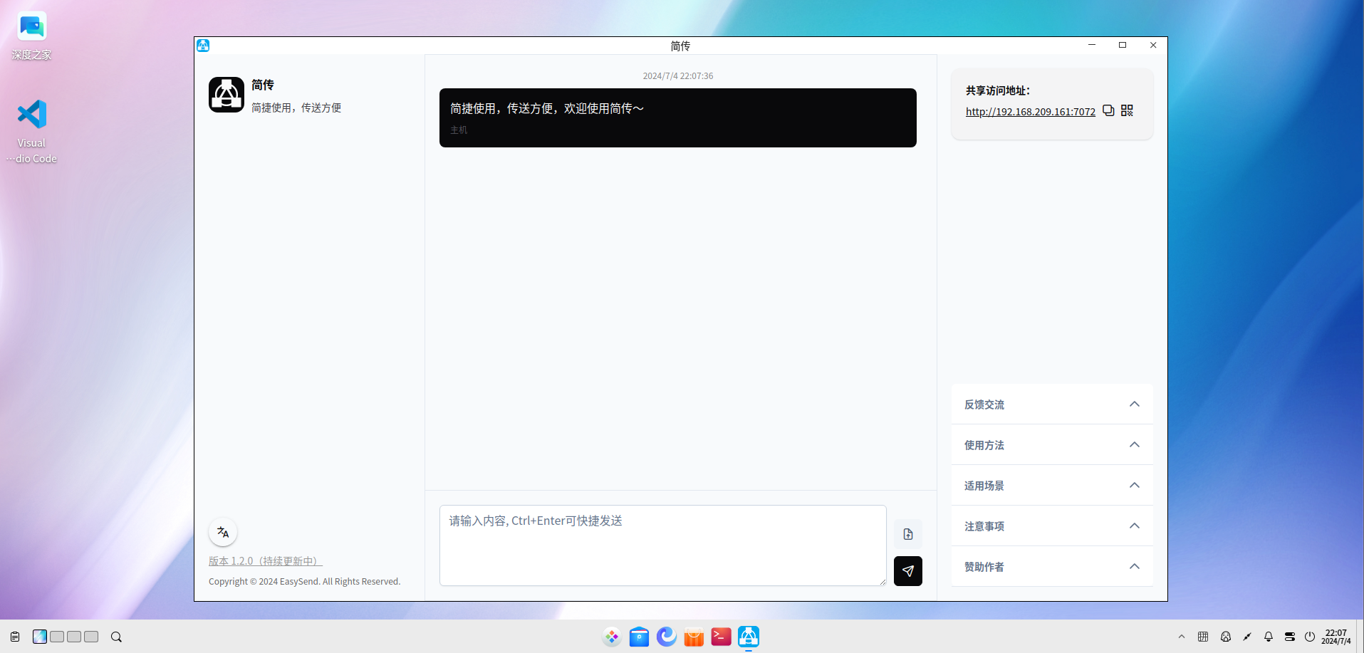 简传是一款不需要在接收端安装就可在局域网环境内共享文本及文件的小工具,仅需一台主机电脑启动,需要获取共享的电脑或手机无需安装只需使用浏览器访问即可,支持windows、linux、mac,支持国产操作系统arm、loongarch多平台