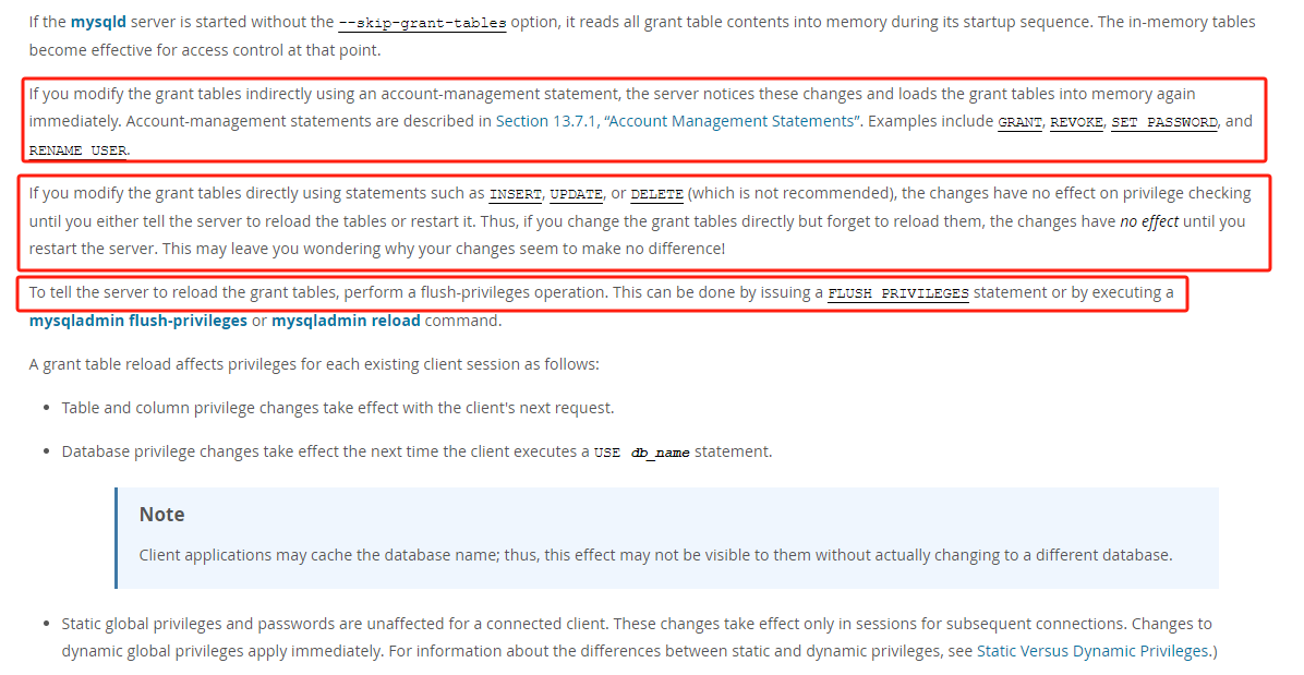 INSERT,UPDATE或DELETE等语句直接修改授权表(不推荐),这些更改并不会加载到内存,除非告诉服务器重新加载授权表或者重启数据库。 flush-privileges操作可以让服务器重新加载授权表。
