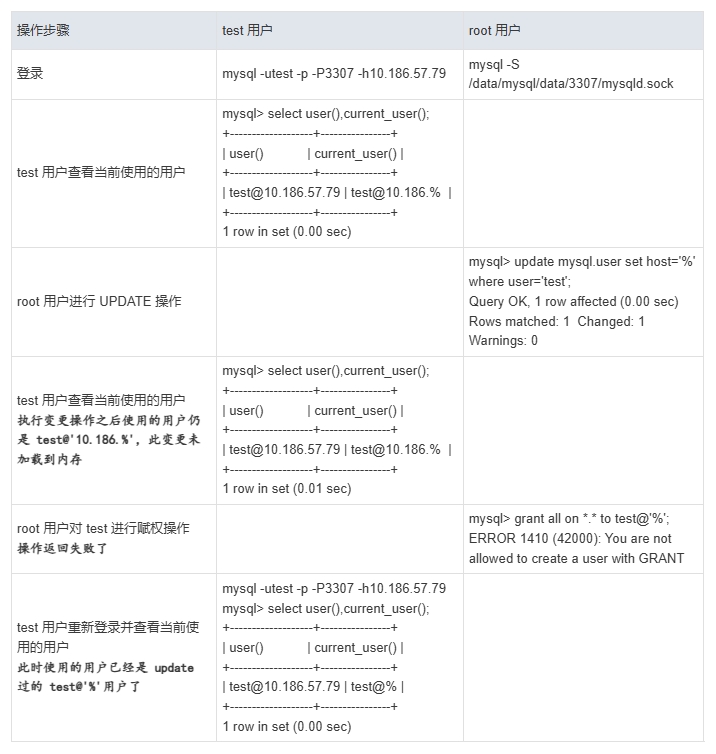UPDATE 操作之后并未将授权表的更改加载到内存,此时内存中并没有 test@'%' 用户,所以第一次 GRANT 操作失败了。