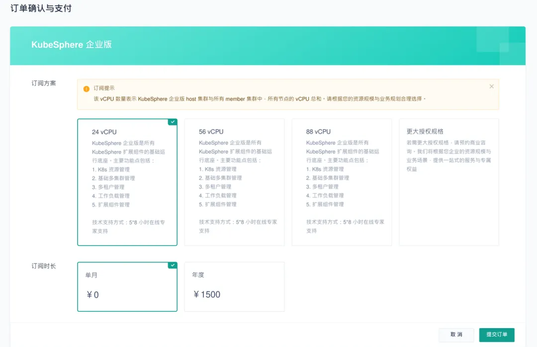 KubeSphere 企业版 4.1.1 目前已经正式发布,推出「在线订阅」模式,致力于让云原生技术更加普及和可负担,以惠及更多中小企业。现在,中小企业每年仅需支付¥1500 起,即可获得近千家企业生产环境验证、多重安全与防护加固,并提供专家级在线支持的商用云原生操作系统,大幅降低采用云原生技术的初始成本。