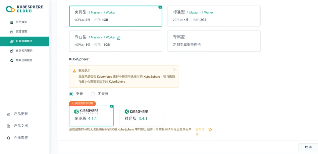 订阅 KubeSphere 企业版之后,即可部署和激活 KSE 4.1.1 。如果使用 KubeSphere Cloud ,可以在新建轻量集群时勾选企业版 4.1.1 。安装指南可以参考 https://docs.kubesphere.com.cn/v4.1.1/03-installation-and-upgrade/。初次使用可享受 30 天免费订阅。
