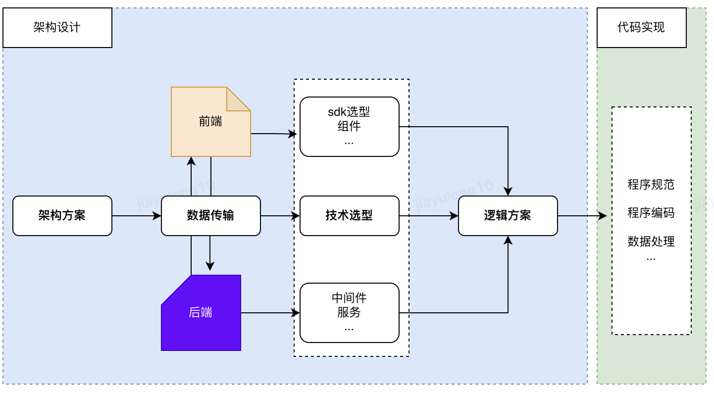 1. 架构设计和代码实现解耦:架构设计根据产品逻辑设计系统功能的架构方案、数据传输交互、技术选型、逻辑方案;代码实现则主要侧重于具体程序编码、规范、具体数据处理。
