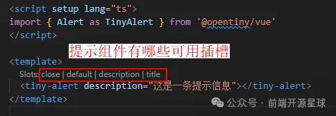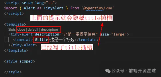 对于已经配置过的插槽,也会进行隐藏,比如 title 插槽已经配置过,就不再显示在提示中。