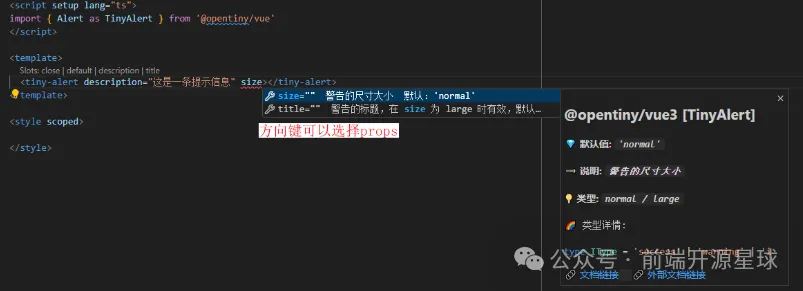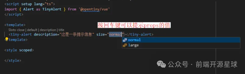 选中 props 之后,按 Enter 回车键会提示可选的 props 值,Alert 组件的 size 有两个可选值:normal / large。