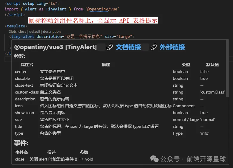 这时我们将鼠标移到组件名称上,会看到完整的 API 表格提示。