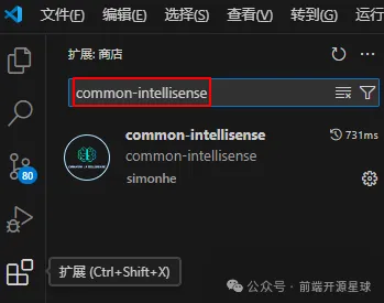 确保你使用的 VSCode 代码编辑器,使用 Ctrl + Shift + X 快捷键,呼起"扩展"抽屉,输入 common-intellisense 关键字找到 common-intellisense 插件,点击安装。