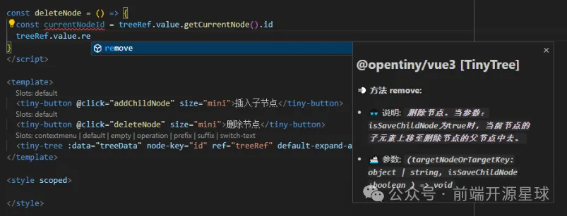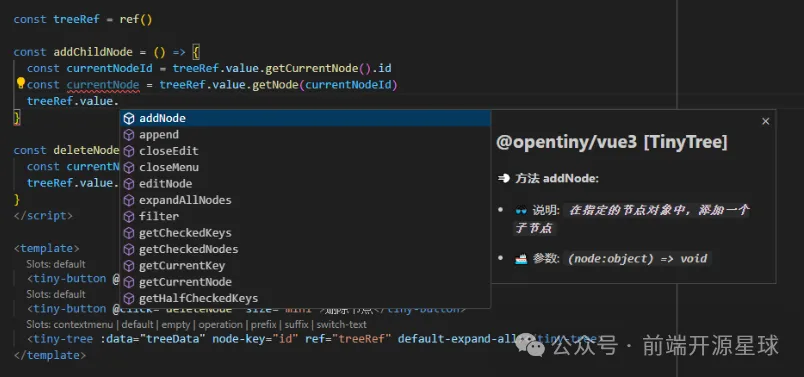输入 treeRef.value. 时,会提示 Tree 组件暴露出来的方法列表。