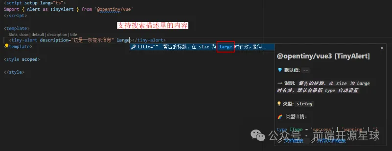 值得一提的是,不仅支持 props 名称的过滤,还支持 props 描述的过滤,比如输入large,可以提示出 title 属性,因此 title 属性的描述中有 large 关键词。
