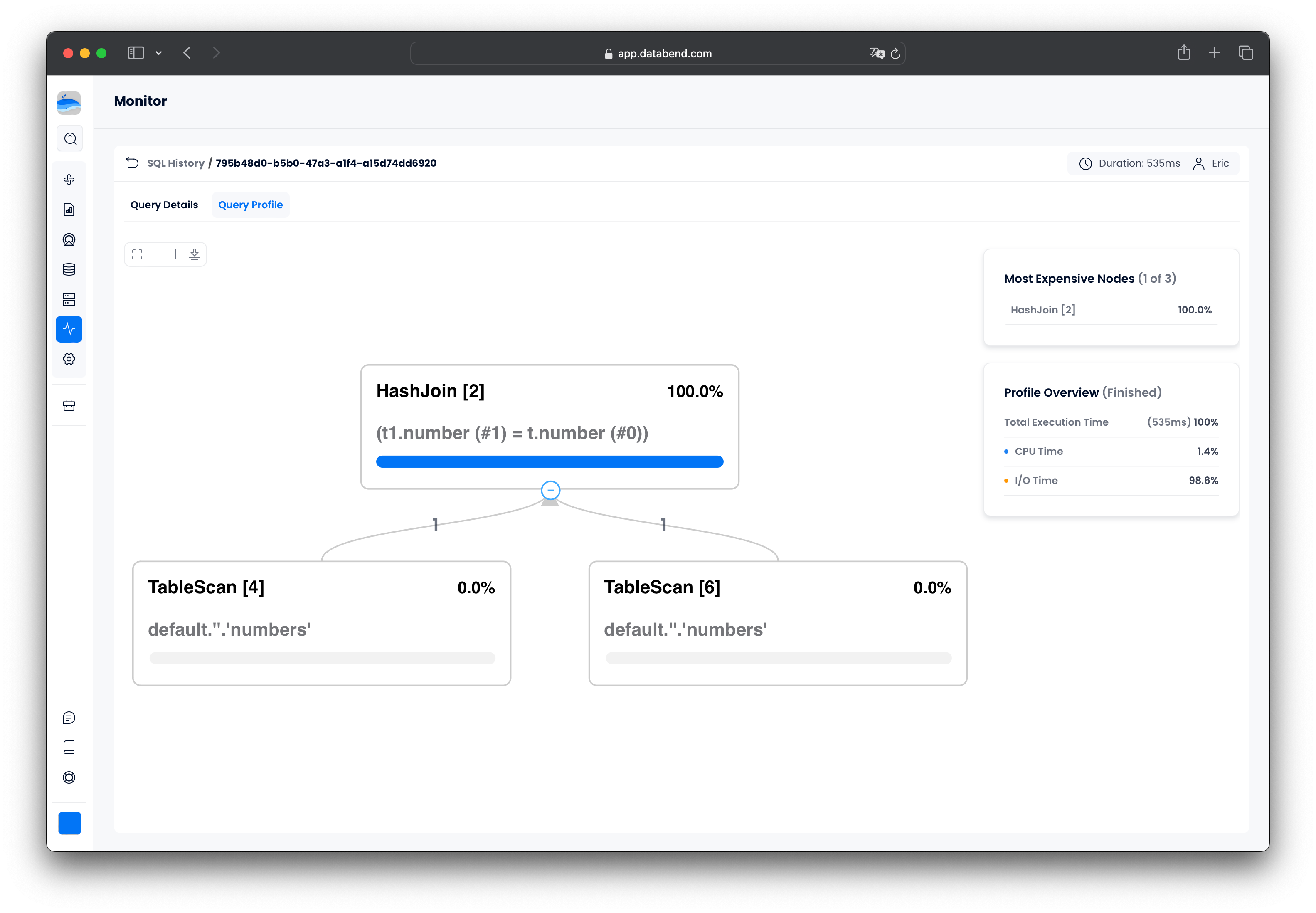 在 Databend Cloud 中,您可以直接访问查询分析。要查看某个查询的查询分析,请导航到 Monitor > SQL History,从历史列表中选择一个 SQL 语句,然后点击 Query Profile 标签。如果您使用的是自托管的 Databend,可以使用 EXPLAIN 命令作为替代。