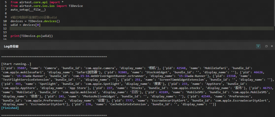 ps(udid) 可以直接查询当前所连接设备上正在运行的进程列表,并将进程的 pid 、 name 、 bundle_id 等以字典的形式展现出来,可以根据自己的需求去调用。