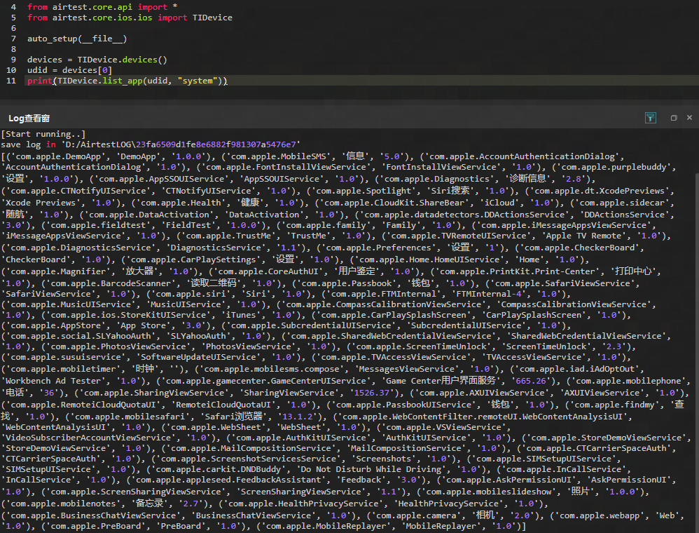list_app() 接口,我们可以查询本地所连接设备上安装的应用列表,同时该接口支持对类型进行筛选,其中括号内的参数 udid 所填的是需要查询的设备 udid , app_type 的话,是可以传入需要列出的应用程序类型,包括 user/system/all 。