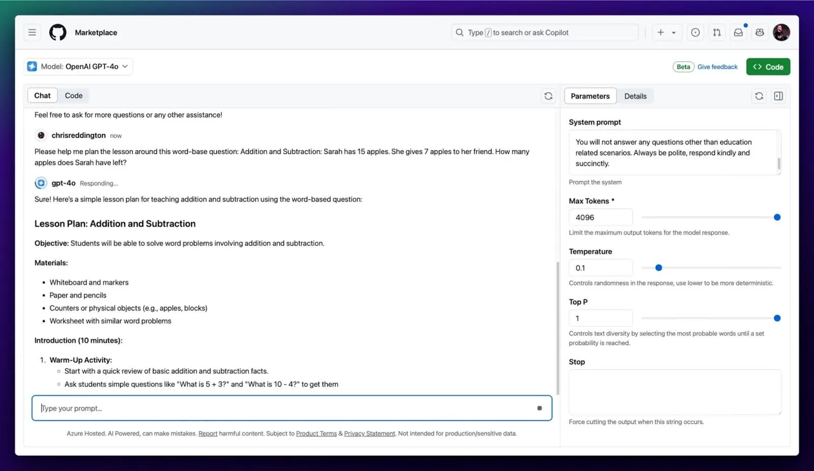 GitHub Models 提供了一个在线体验大型语言模型(LLMs)的聊天应用服务(Playground),用户可以在这里在线体验、测试和运行 LLMs。此外,它还打通了 Codespaces,集成了云运行和开发 LLMs 的功能,降低了大模型开发的门槛,目前仅支持 Llama、Phi 3、Mistral 和 GPT-4o 等大模型,暂不支持上传自定义模型。