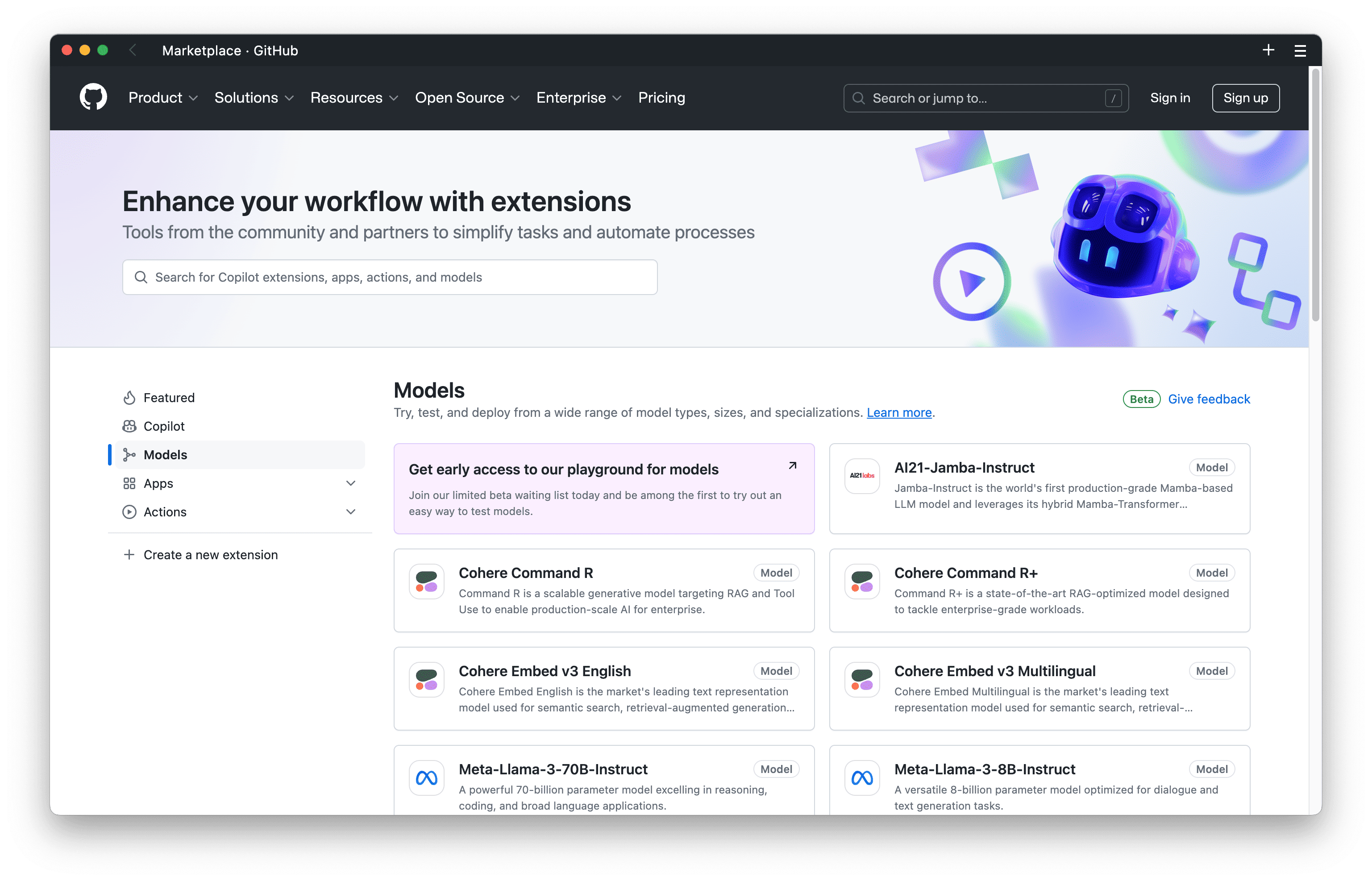 众所周知,本地运行 LLMs 需要下载模型(体积大),并且还比较吃硬件配置。近日 GitHub 推出了 GitHub Models 服务,让开发者可以在 GitHub 上免费测试 Llama、Phi 3、Mistral 和 GPT-4o 等大模型。但是,目前该服务仍处于公测阶段,类似早期的 Copilot,并未完全开放。需要先提交申请(waitlist)等待审核通过后才可以使用。