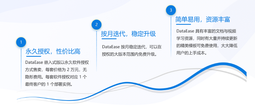 6. 灵活的成本定价模型:DataEase嵌入式版采用的是固定成本定价模型,避免了因使用量增加而导致成本上升的风险;