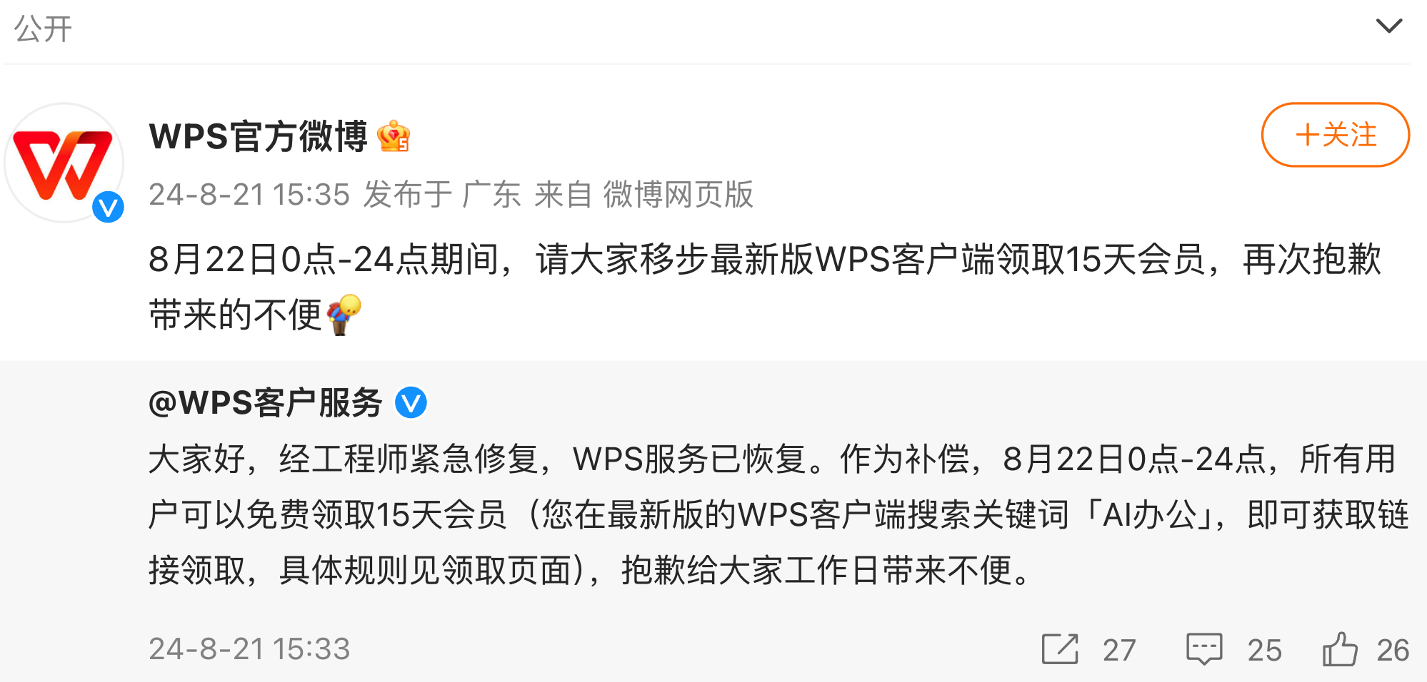 2024.8.21 16点更新:WPS服务已恢复,用户可免费领取 15 天会员。
