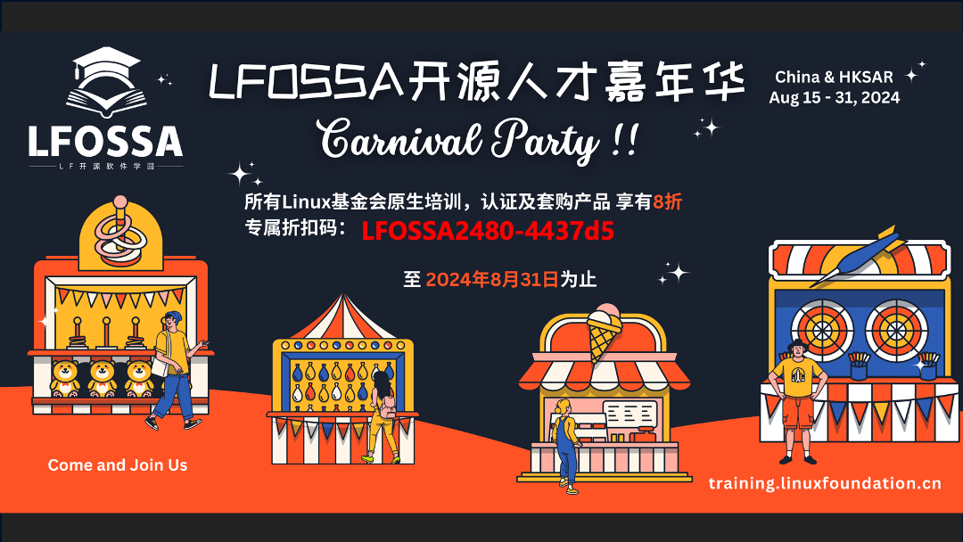 此外,为了帮助更多朋友可以在开源事业上更上一层楼,我们会在LFOSSA开源人才嘉年华期间提供专属的折扣,用于购买所有Linux基金会原生培训,认证及套购产品。折扣名额限量前 50 名,先到先得!