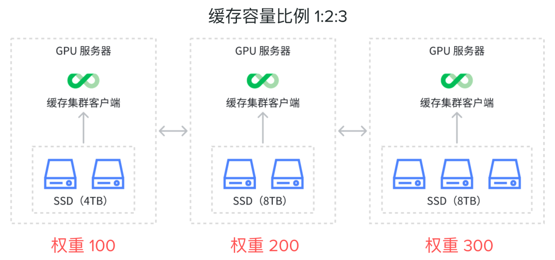 为了避免这种情况,我们引入了「缓存节点权重」的概念,允许用户根据实际环境动态或静态地调整每个 GPU 节点的权重。例如,第一台 GPU 服务器的缓存权重可以设置为默认值 100,第二台为 200,第三台为 300,这些权重与 SSD 容量的比例(1:2:3)相对应。通过这种差异化权重设置,可以更有效地利用各缓存机器的存储资源,优化整体系统的性能。这种方法为处理不同硬件配置的机器提供了一个典型的解决方案。