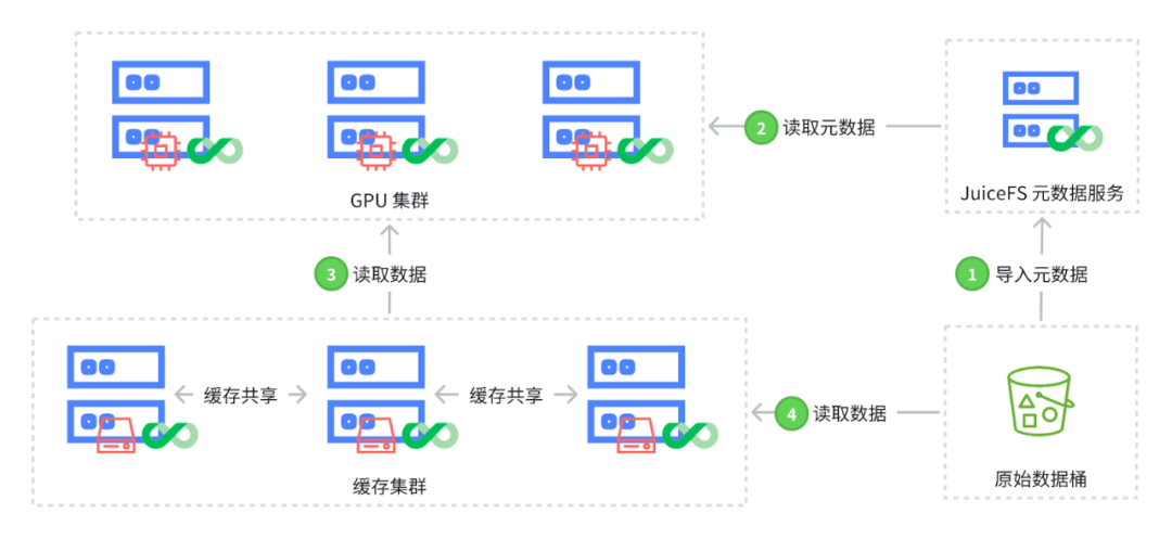 第三步,读取数据。在推理等场景中,通常会配置分布式缓存以优化数据读取。由于在第一步中仅导入了元数据而未导入实际数据,初次通过分布式缓存读取时将无法直接获取数据。