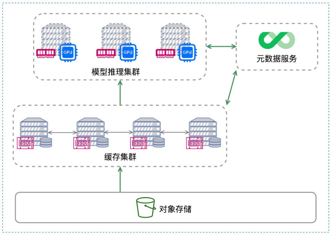 - 步骤 2:读取元数据并获取数据。在读取到元数据后,客户端会首先尝试通过机房内的缓存集群获取所需数据。如果之前进行了缓存预热,那么大多数情况下可以直接在机房内的缓存集群中命中所需的模型数据;