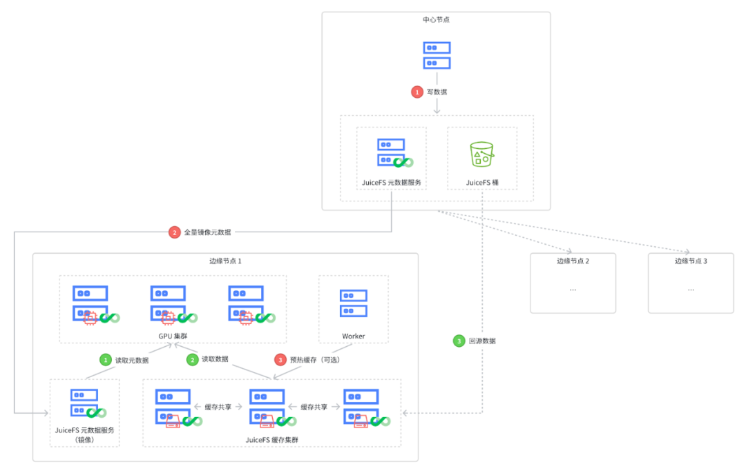 因此,整个数据读取流程是畅通无阻的。即使部分数据未被预热或新数据尚未预热成功,也可以通过自动回源的方式,从中心的 JuiceFS 存储桶中拉取数据。