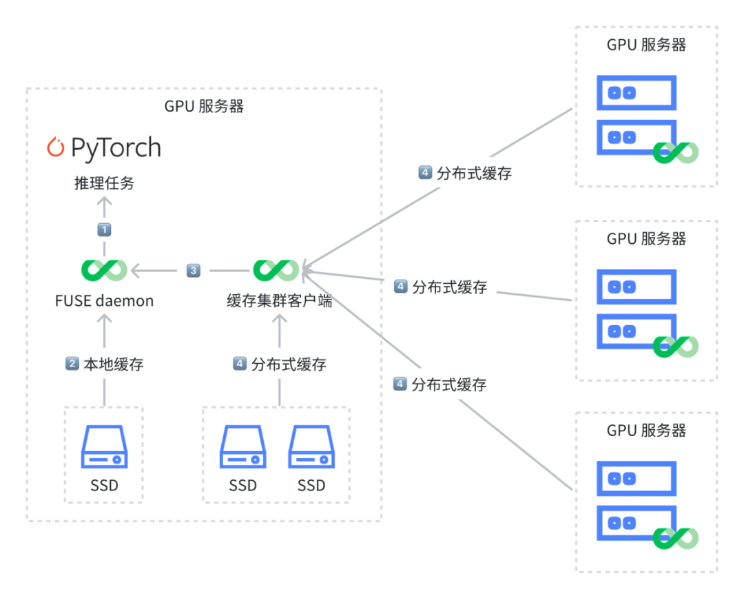 - 其次,通过缓存集群客户端,可以让推理任务访问其它 GPU 服务器上的数据,实现一个分布式缓存集群的效果。