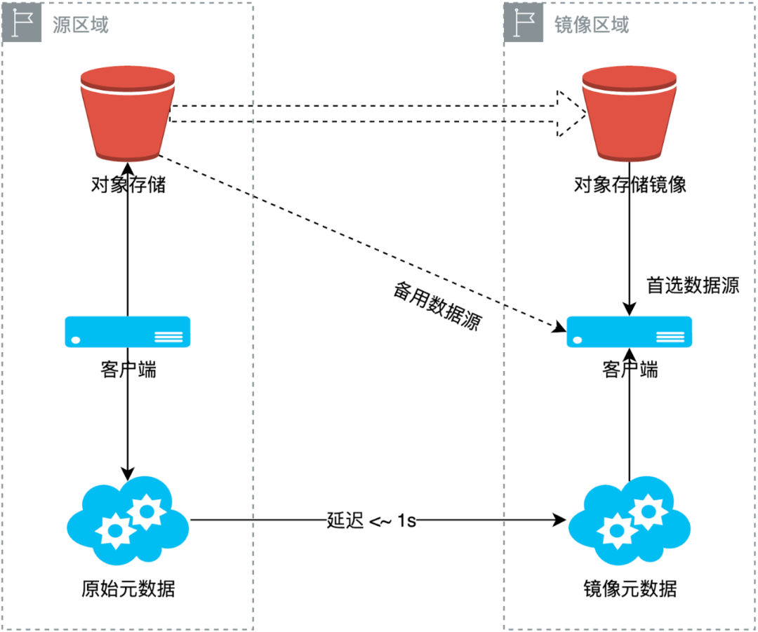 下图展示了在镜像文件系统中数据写入与数据读取时的流程。图中展示了两个区域:源区域和镜像区域。当数据在源区域写入时,JuiceFS 会自动将数据从源区域复制到镜像区域。