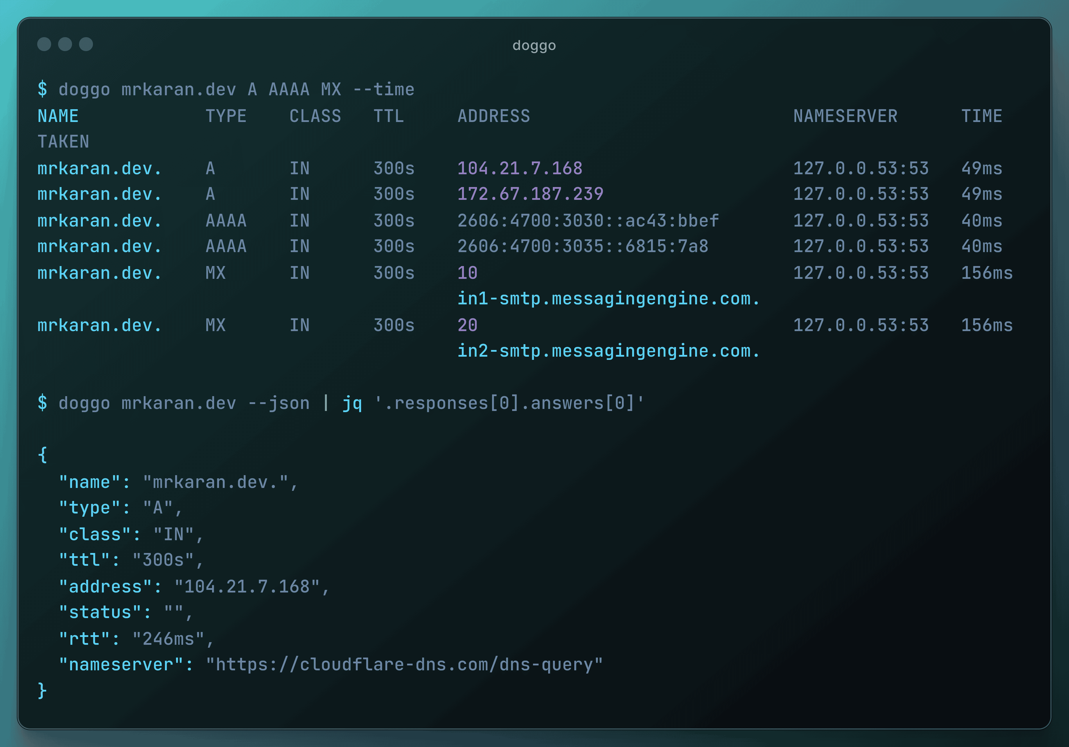 8、doggo:友好的命令行 DNS 查询工具。该项目是用 Go 语言编写的命令行 DNS 客户端工具,安装简单且开箱即用。它提供了友好的命令行界面,可快速显示 DNS 记录信息,支持高亮显示、响应时间和多种 DNS 记录类型等,适用于网络诊断等场景。