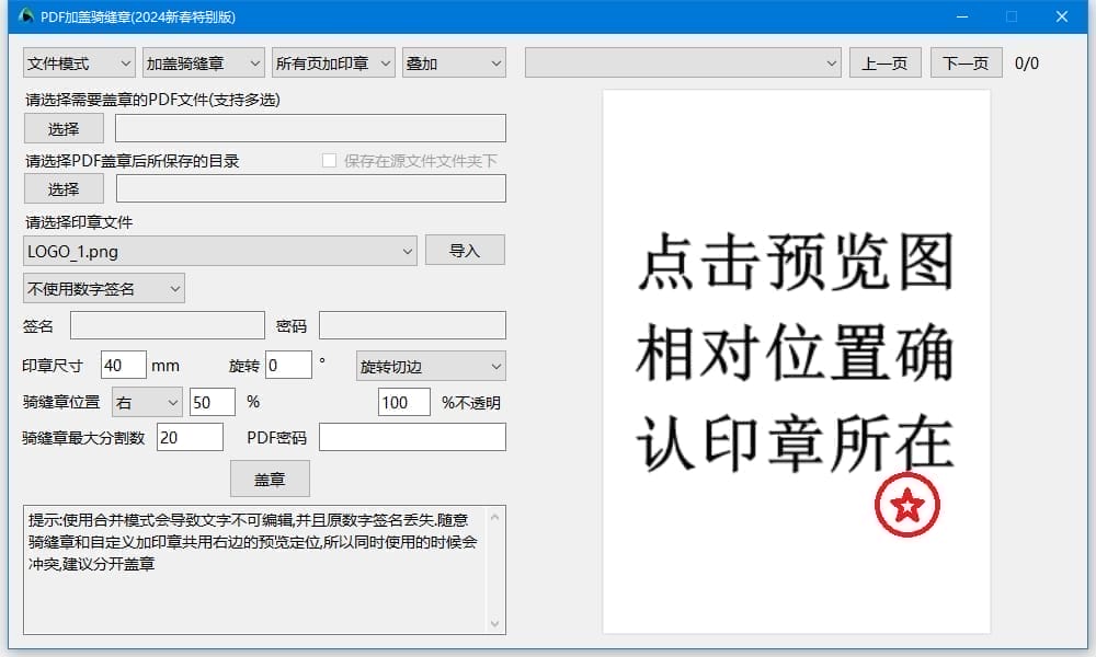 5、PDFQFZ:免费的 PDF 加盖骑缝章工具。该项目是用于在 PDF 文件上加盖骑缝章的工具,适用于 Windows 平台。它不仅免费且开源,使用时可以指定目录,对多个 PDF 文件进行批量处理,并支持预览、调整印章大小和位置等功能。