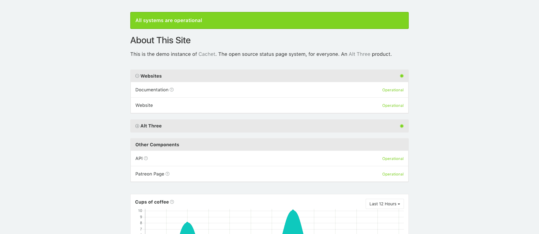 22、cachet:PHP 写的服务运行状态页面。该项目是采用 Laravel+Bootstrap 构建的服务状态监控和管理平台,免费且开源。它不仅可以自动监控服务的正常运行时间,还提供了管理后台支持主动记录和维护事故信息,支持多语言、自托管、移动端适配和邮件通知等功能。