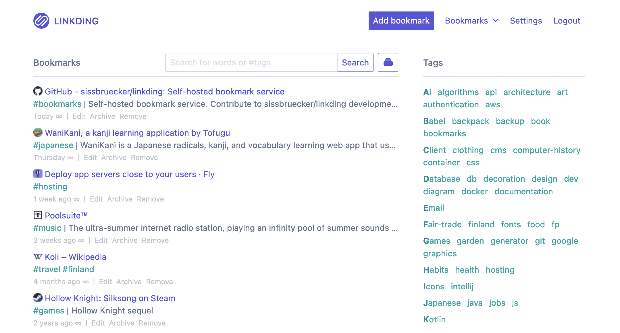 26、linkding:极简的浏览器书签管理平台。该项目是基于 Django 构建的浏览器书签管理平台,它提供了简洁易用的 Web 界面和强大的搜索功能,支持标签分类、批量编辑和稍后阅读等功能,并配有 Chrome 和 Firefox 插件,方便用户随时随地保存和访问书签。