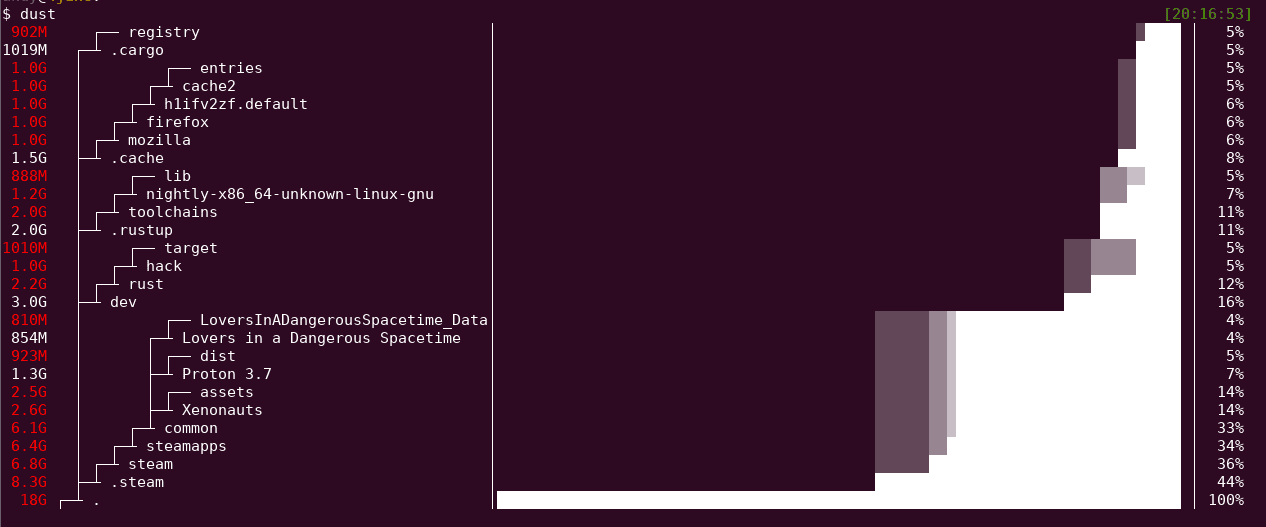 31、dust:快速显示硬盘使用情况的命令行工具。这是一个可视化磁盘使用情况的命令行工具,名字源自 du 和 Rust 编程语言组合。它体积小巧、运行速度快,能够以直观的方式展示磁盘空间概览。
