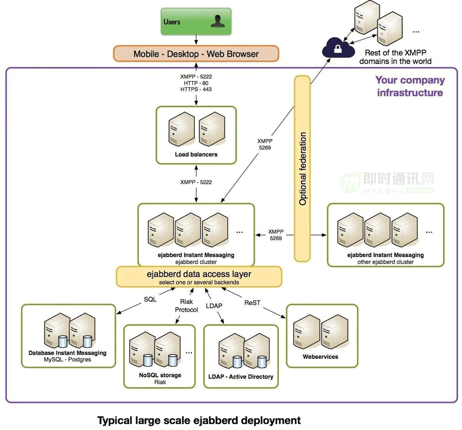 1999年Jeremie Miller,首先提出了Jabber,一种为实现即时消息和存在的开放技术,后续基于这个协议,开发了一个开源的服务实现jabberd。后续,IETF国际标准组织介入,成立Extensible Messageing and Presence Protocol(XMPP)工作组,并开始标准化工作。