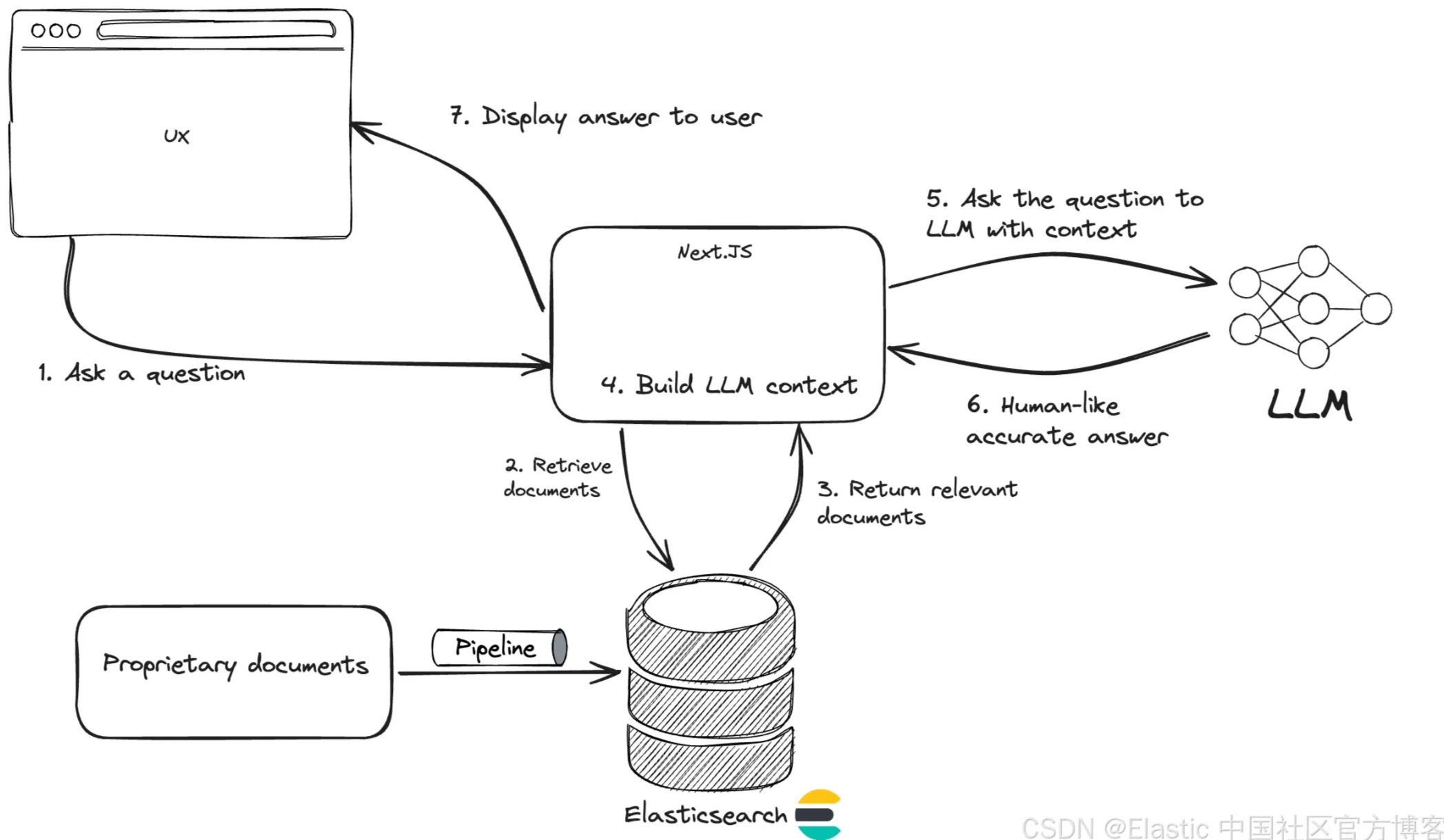 从高级架构的角度来看,AI 对话式搜索体验的核心是 RAG 应用程序,它具有先进的检索系统(在我们的例子中是 Elasticsearch)和对话式界面。