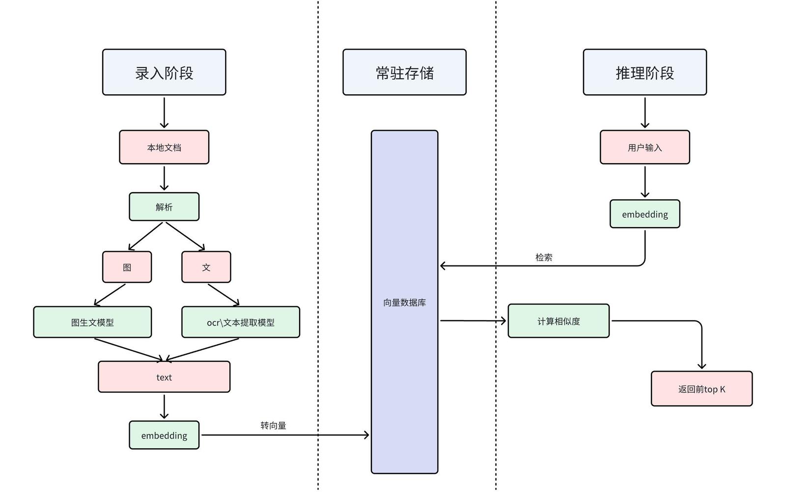 下面流程图上展示了openKylin智能模糊搜索的工作流程,涵盖了从输入到推理的全过程。系统首先通过解析本地文档,将内容分为图像和文字两类,并分别使用图像文档模型和OCR文字提取模型进行处理。所有信息最终被转换为统一的文本格式,并通过embedding技术转化为高效的向量化表示,存储在专用的向量数据库中。在推理阶段,用户输入的信息同样会被转化为嵌入,通过与数据库中的嵌入进行相似度计算,系统能够快速精准地返回与用户需求最相关的前K个结果。