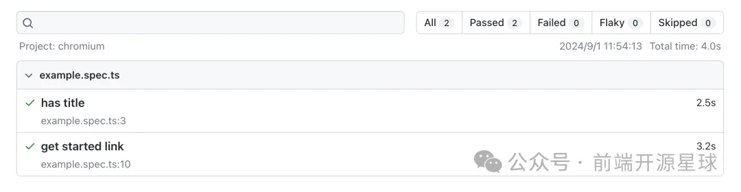 这是执行全量测试用例,还可以执行部分用例:npx playwright test tests-examples,只执行 tests-examples 目录下的测试用例。