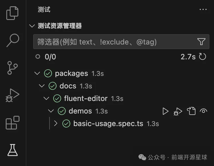 安装完之后,VSCode 左侧会多出来一个测试的面板,可以看到当前项目所有的测试用例,点击播放按钮就可以执行测试用例,这个和 --ui 那个可视化界面有点类似。