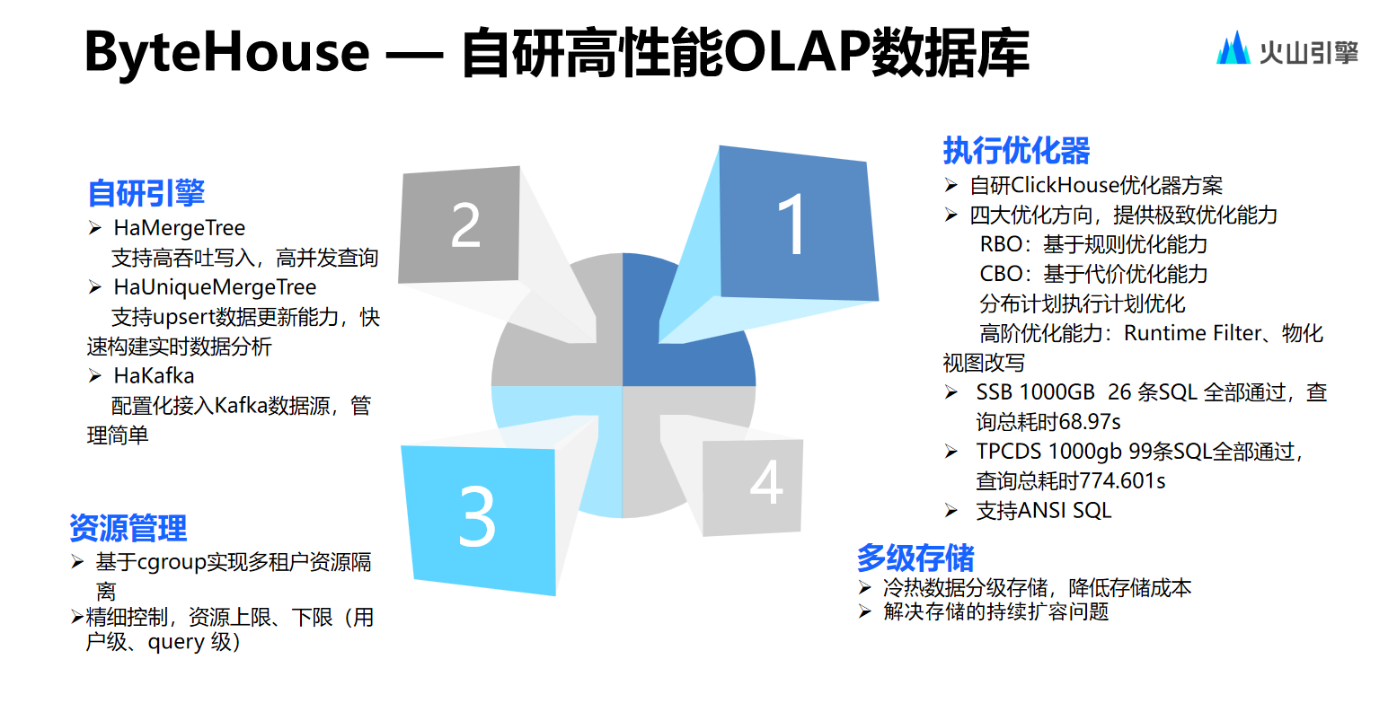 在这里,先简单介绍一下 ByteHouse。相较于原生 Clickhouse,ByteHouse 针对多个领域做了性能优化。
