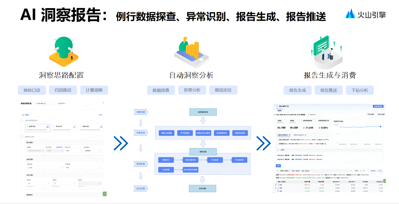 其一为数据开发,旨在帮助进行数据准备的人员能够准备更具价值的数据;其二是数据分析,期望能够助力用户进行异常指标查询以及异常归因;其三为数据消费,通过对话式问答的方式来提升提取信息的效率。