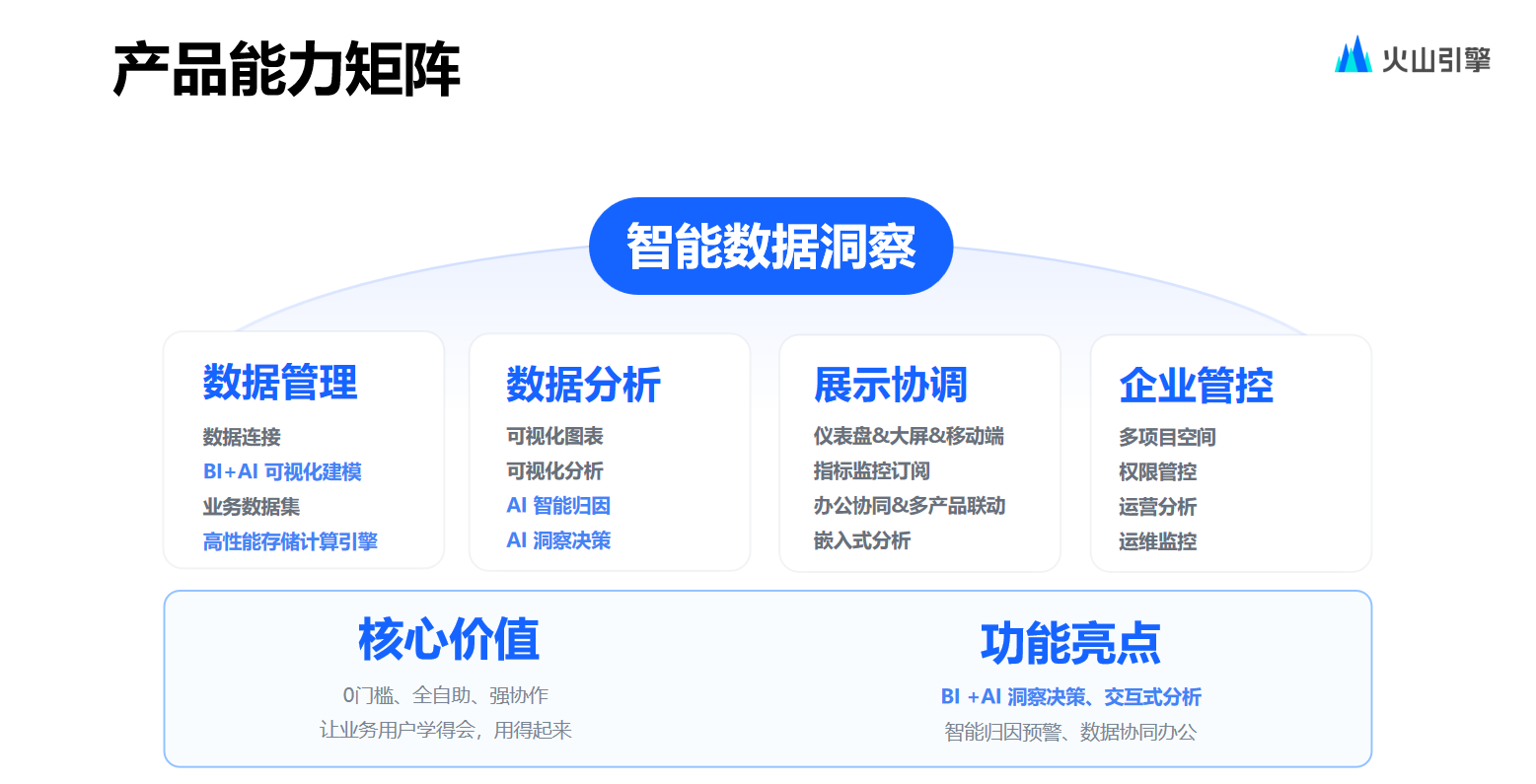 当前,火山引擎数智平台旗下的智能数据洞察 DataWind 已构建起包含了数据准备与管理,数据分析,以及多端展示等功能的相对完善的产品能力矩阵,同时赋予产品系统高度可运维优势。