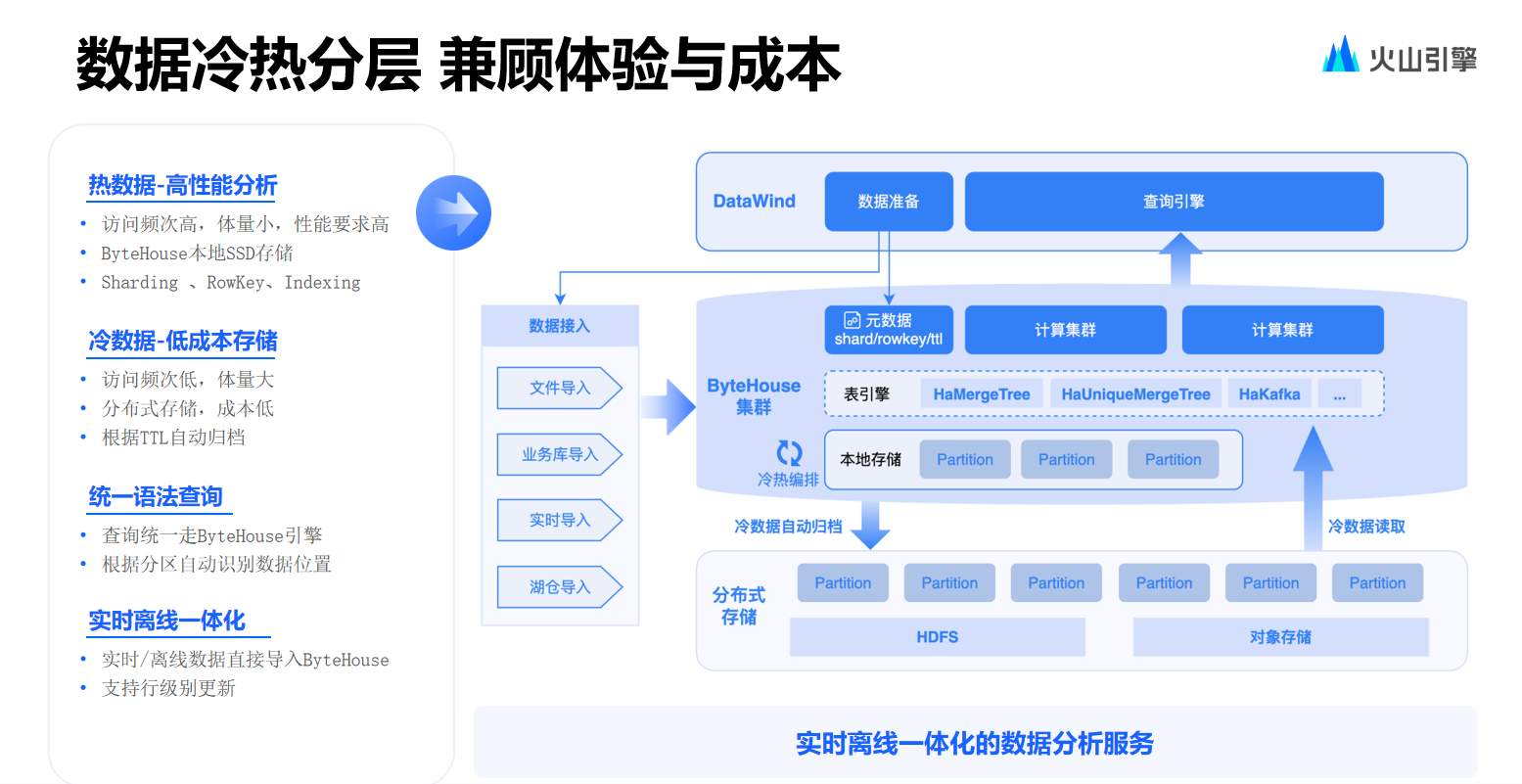 针对这个问题,解决的思路是提供数据冷热分层,对于最为常用的数据,例如最近 7 天或 14 天的数据,可以放置于 ByteHouse 中进行存储。而相对距离当前时间较远的数据,则放置在存算分离的 ByteHouse 集群当中,通过更为廉价的方式来实现查询。至于时间更为久远的数据,比如过去一年的数据,就存于 Hive 表内,可以通过 Python 或者 Spark 的方式来进行查询。