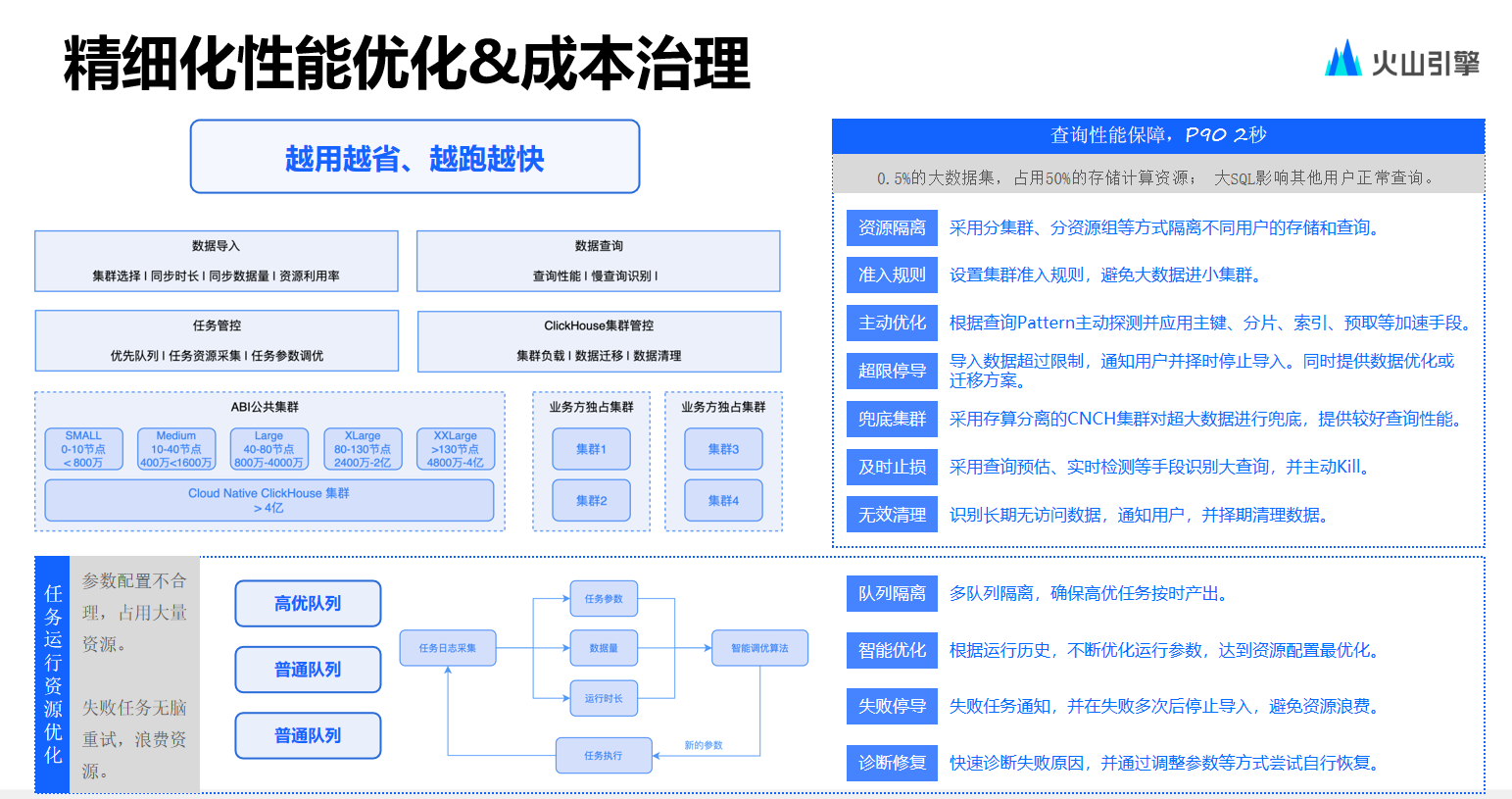 同时,如何充分有效地利用 ByteHouse 高性能引擎也十分重要。比如应该向什么样的集群推荐数据集,选择什么样的表引擎,以及确定什么样的分片和排序键策略等。这些为问题对于性能而言都相当关键。
