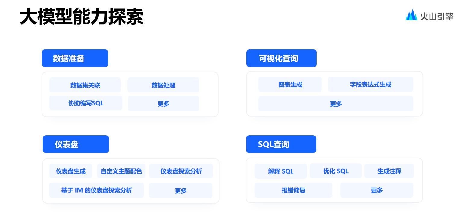 三是 2023 年年底。内部团队面对迅速发展的 ChatGPT,认为它会对 BI 产生具有如“掀桌子”一般颠覆性的影响,因此经过一段时间的尝试,便在今年 4 月份对内进行了产品发布。就目前而言落地效果不错,已经有几千人在高频使用这一内部产品。