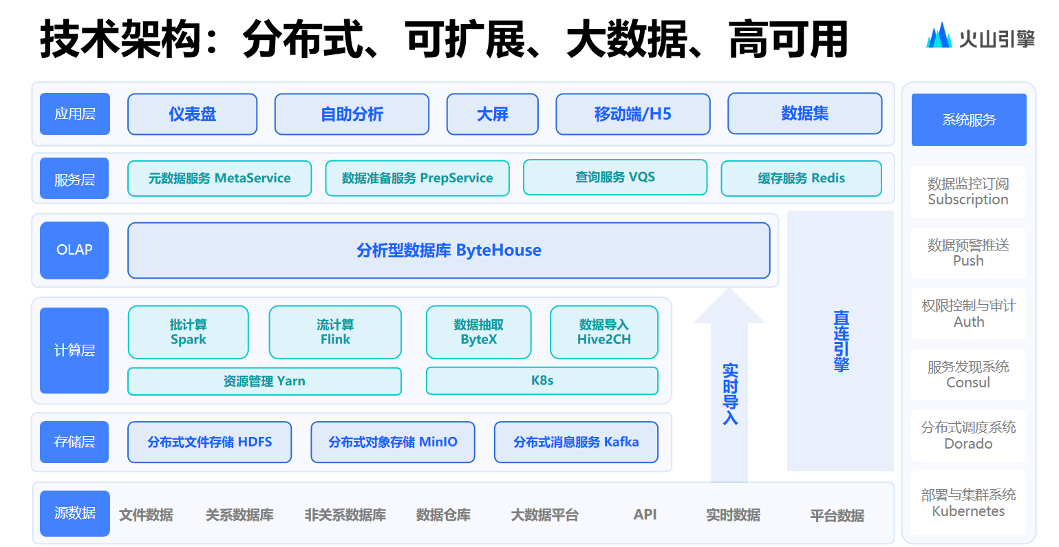 为了满足用户对性能的需求,开发中采取了有别于主流 BI 厂商的思路。虽然 DataWind 产品支持直连目前通用的大部分数据源、数据引擎与数据库。但在企业内部用户更多地使用“抽取”,即围绕自研分析性数据库 ByteHouse 建设了非常重的抽取链路,把公司内几乎全部需要进行数据分析的数据全部放入 ByteHouse 中。